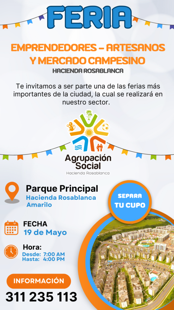 Hola, te invitamos a participar de una de las principales ferias de la ciudad, la cual se realizará en nuestro sector Hacienda Rosablanca (Amarilo). En la parte inferior esta el link de pre-inscripción.